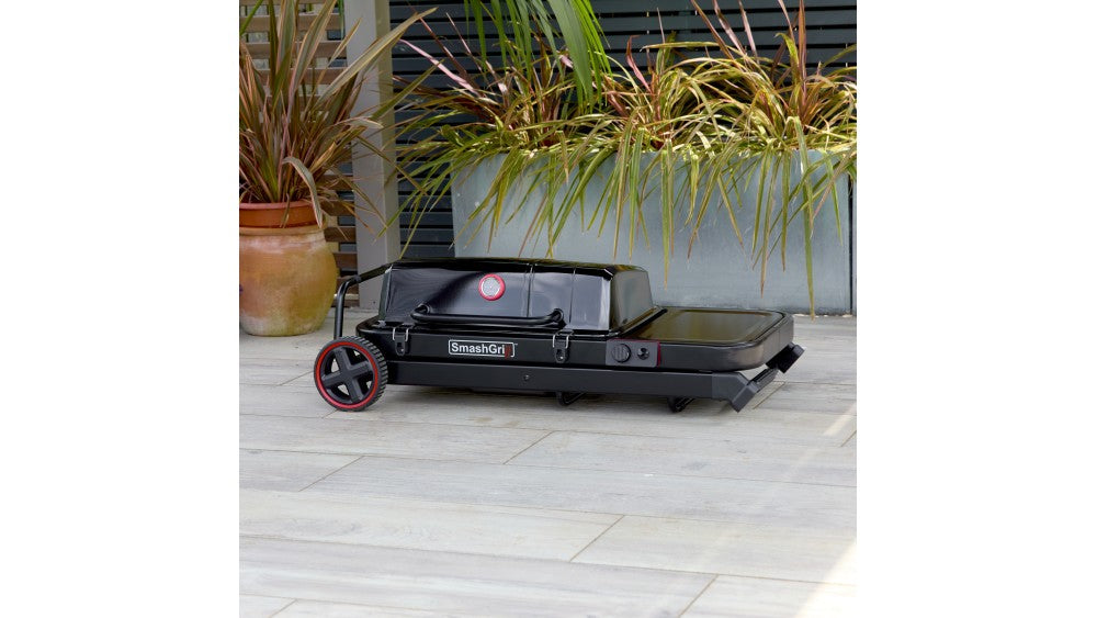 This compact addition to the SmashGrill family lets you barbecue on the go! Its fold-down frame with wheels provides a portable cooking solution, perfect for camping trips, beach outings, and small gardens. Featuring a safety lock that secures it in place whether up or down, this grill folds flat for easy storage too, making it ideal for packing into a car boot or garden shed.